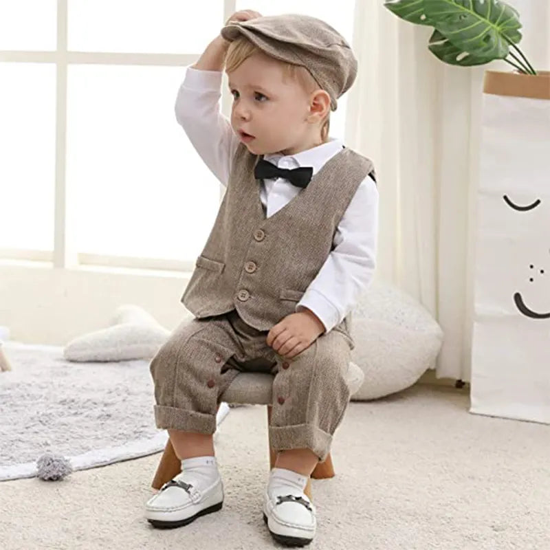Newborn Boy Formal Clothes Set - Gentleman Birthday Romper Outfit with Hat, Vest, and Long Sleeve Jumpsuit Suit